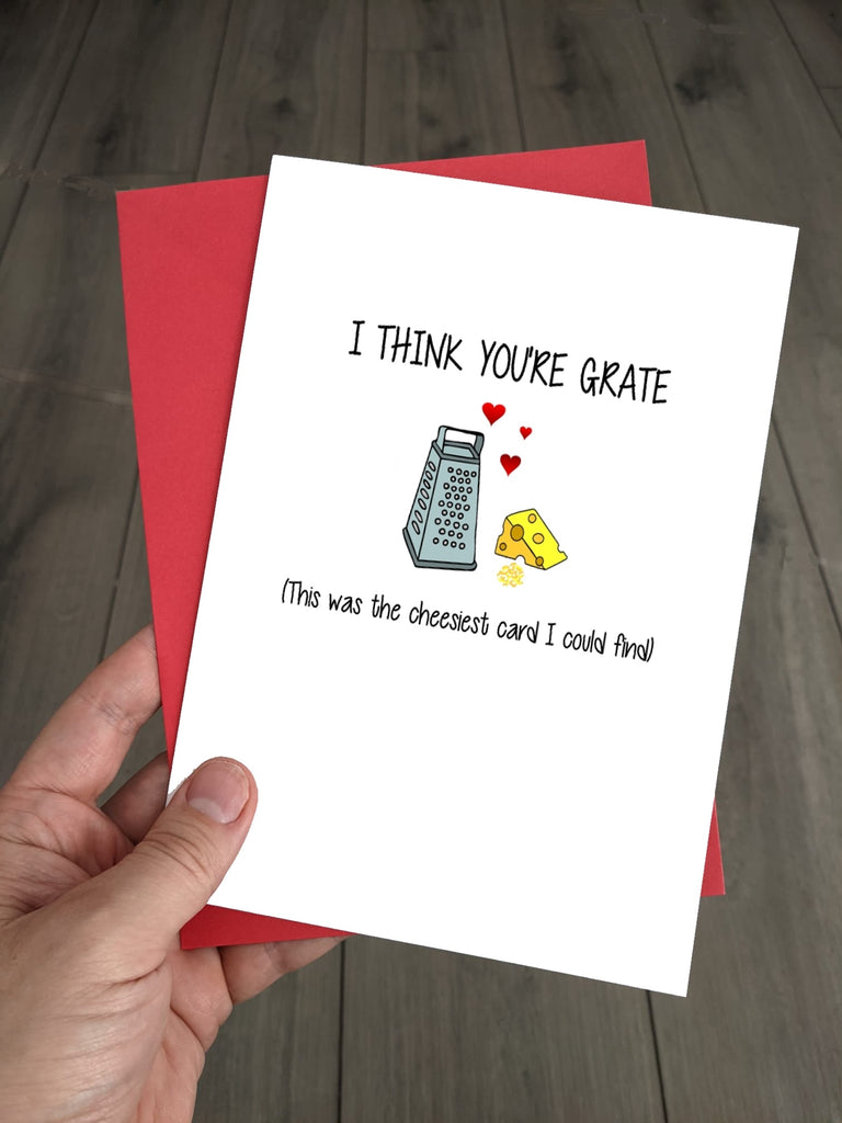 Embrace the cheesiness and spread smiles with our "Cute Pun Birthday/Anniversary Card - I think you're GRATE." Order yours today and make every occasion extra special!