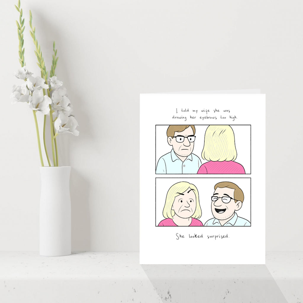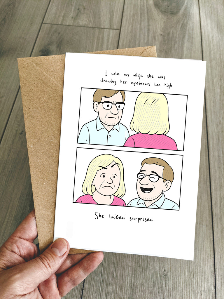 Bring a laugh to someone’s special day with this cheeky birthday card featuring a comic strip gag: "I told my wife she was drawing her eyebrows too high… she looked surprised." Designed with a clean, cartoon aesthetic and smart humour, this card is perfect for husbands, wives, friends, or anyone with a great sense of humour. It’s printed on high-quality A5 card and comes with a rustic kraft envelope – making it as stylish as it is funny. Ideal for fans of witty banter, sarcastic jokes, and eyebrow-raising puns.