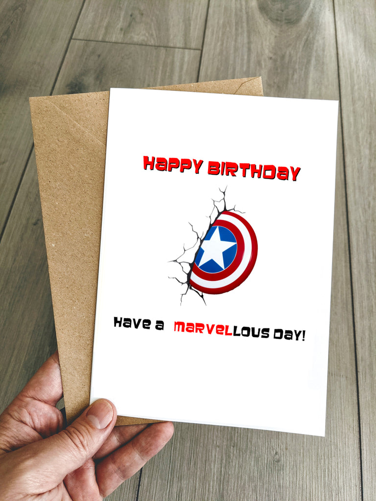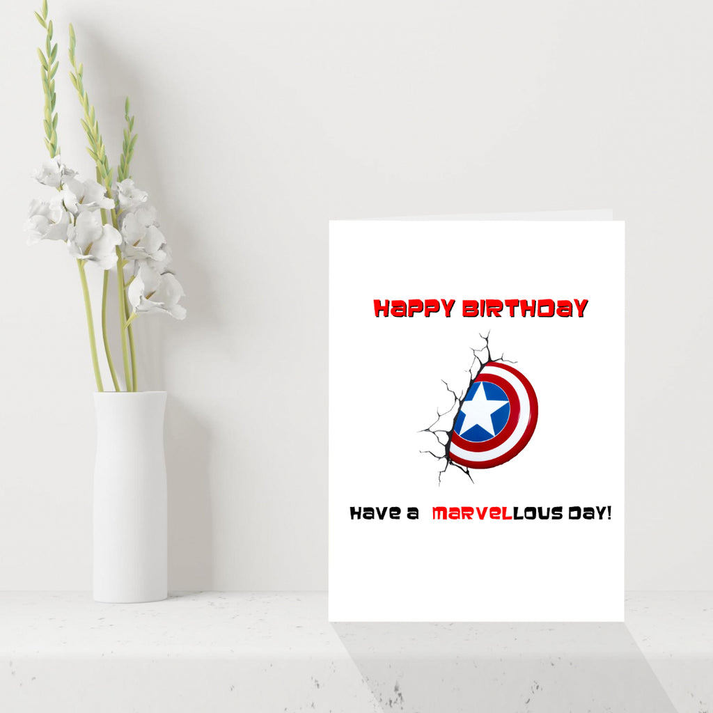 Marvel Superhero Celebration: The front of the card showcases a vibrant Captain America shield design, a symbol of heroism and adventure, with the playful message, "Happy Birthday Have a Marvel-lous day!" It's an exciting way to send birthday wishes that pack a punch.