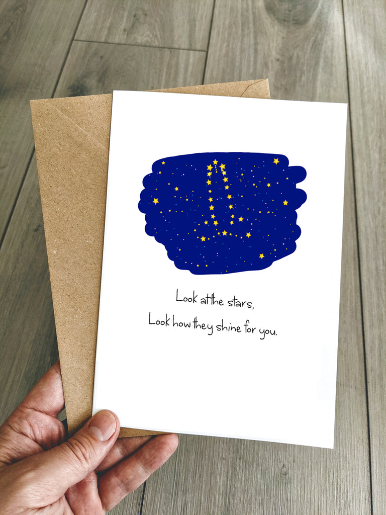 Coldplay Enthusiast's Dream: Ideal for those who love Coldplay, this card offers a humorous twist on the lyrics from Coldplay's hit song "Yellow" with the phrase "Look at the stars, look how they shine for you." It's a playful and memorable choice.