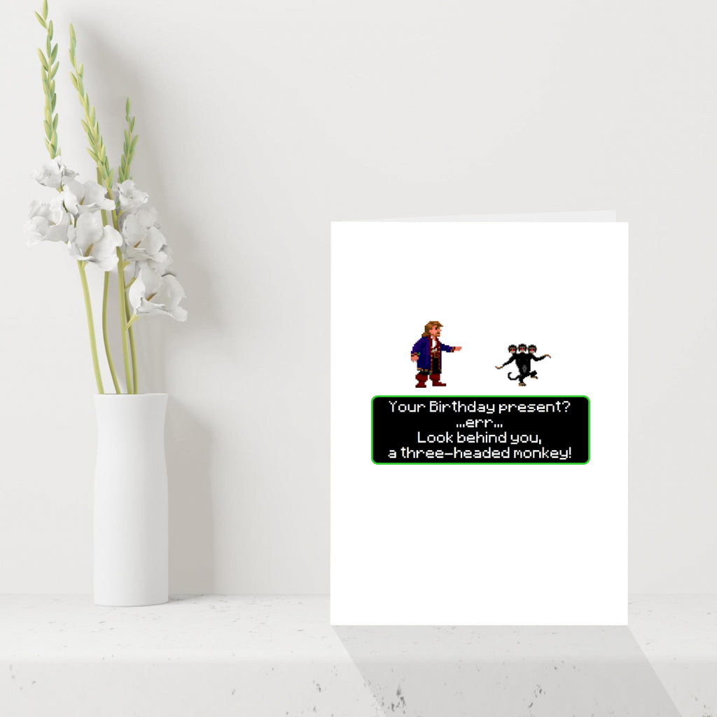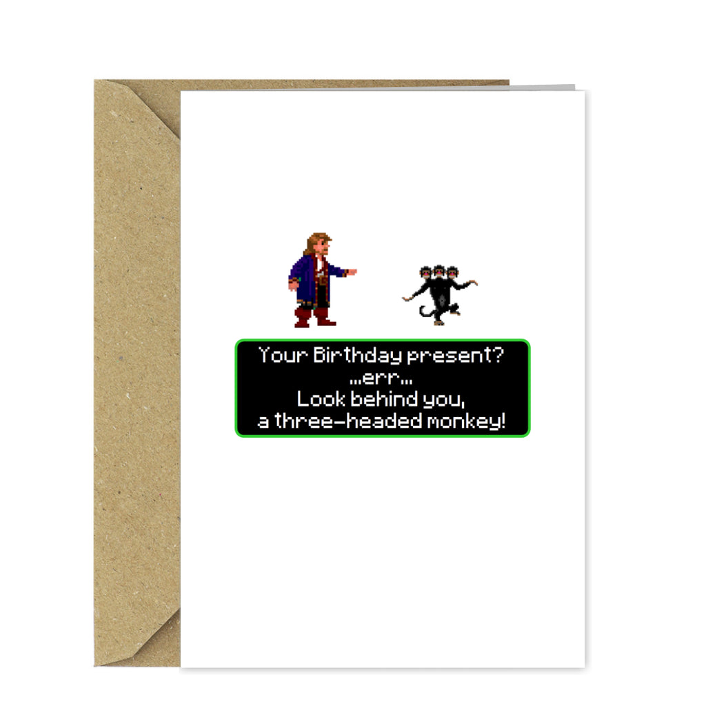 Hilarious Monkey Island Reference: The front of the card reads, "Your Birthday present? ...err... Look behind you, a three-headed monkey!" โ a witty and familiar reference for fans of the classic Monkey Island series.