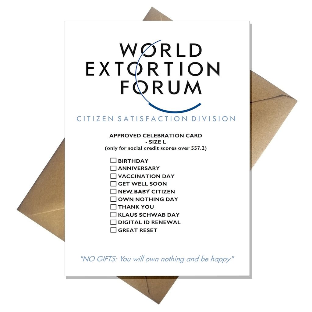 Product Description: Celebrate with a twist of humour on any occasion with our versatile "WEF Birthday Card." Suitable for birthdays, anniversaries, or virtually any event, this card features a playful spoof of the World Economic Forum's logo, humorously altered to read "World Extortion Forum." Packed with satirical humour, it offers a range of witty options that playfully address the WEF's aspirations, including humorous references to the desire for a great reset and unconventional traditions, like eating bugs.