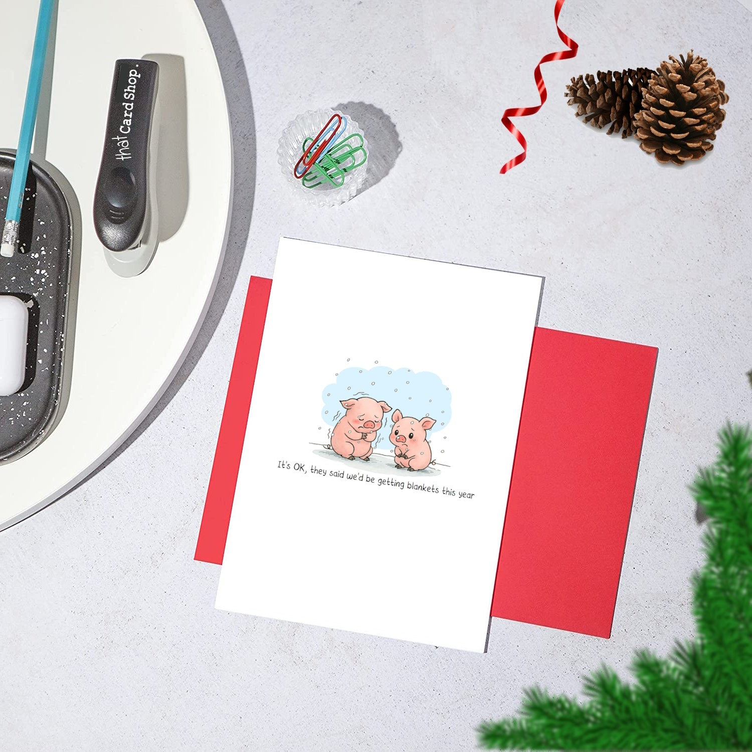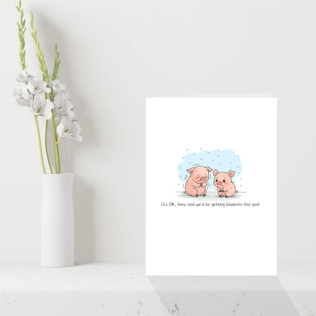 Featuring two adorable cartoon pigs shivering in the snow with the caption “It’s OK, they said we’d be getting blankets this year,” this card delivers classic dad-joke humour with a festive twist. Perfect for friends, family, or anyone who appreciates a good laugh (and a slightly naughty pun). Printed on premium quality A5 card with a bright red envelope included. Blank inside for your own message.
