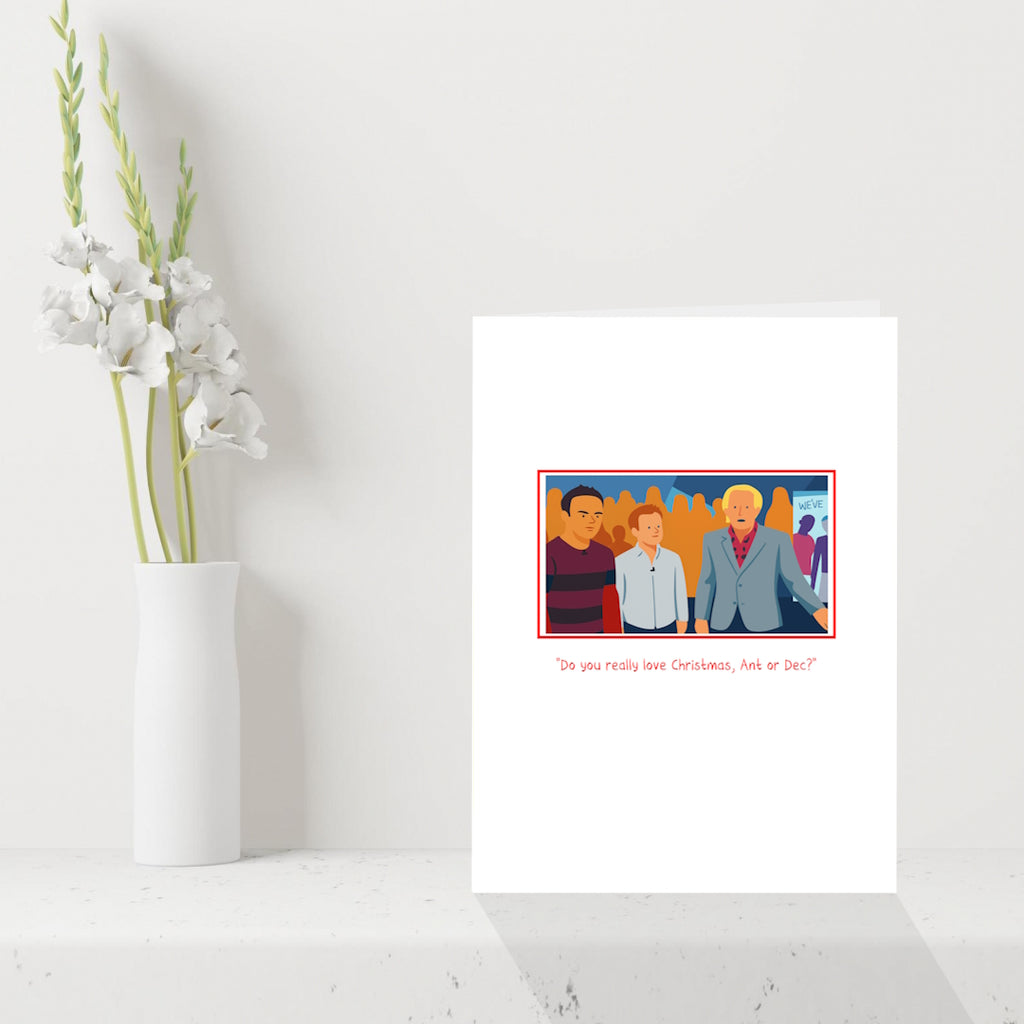 Celebrate Christmas with a classic Love Actually laugh. This funny A5 Christmas card features Billy Mack getting interviewed by Ant and Decโฆ and, true to form, having absolutely no idea which one is which.